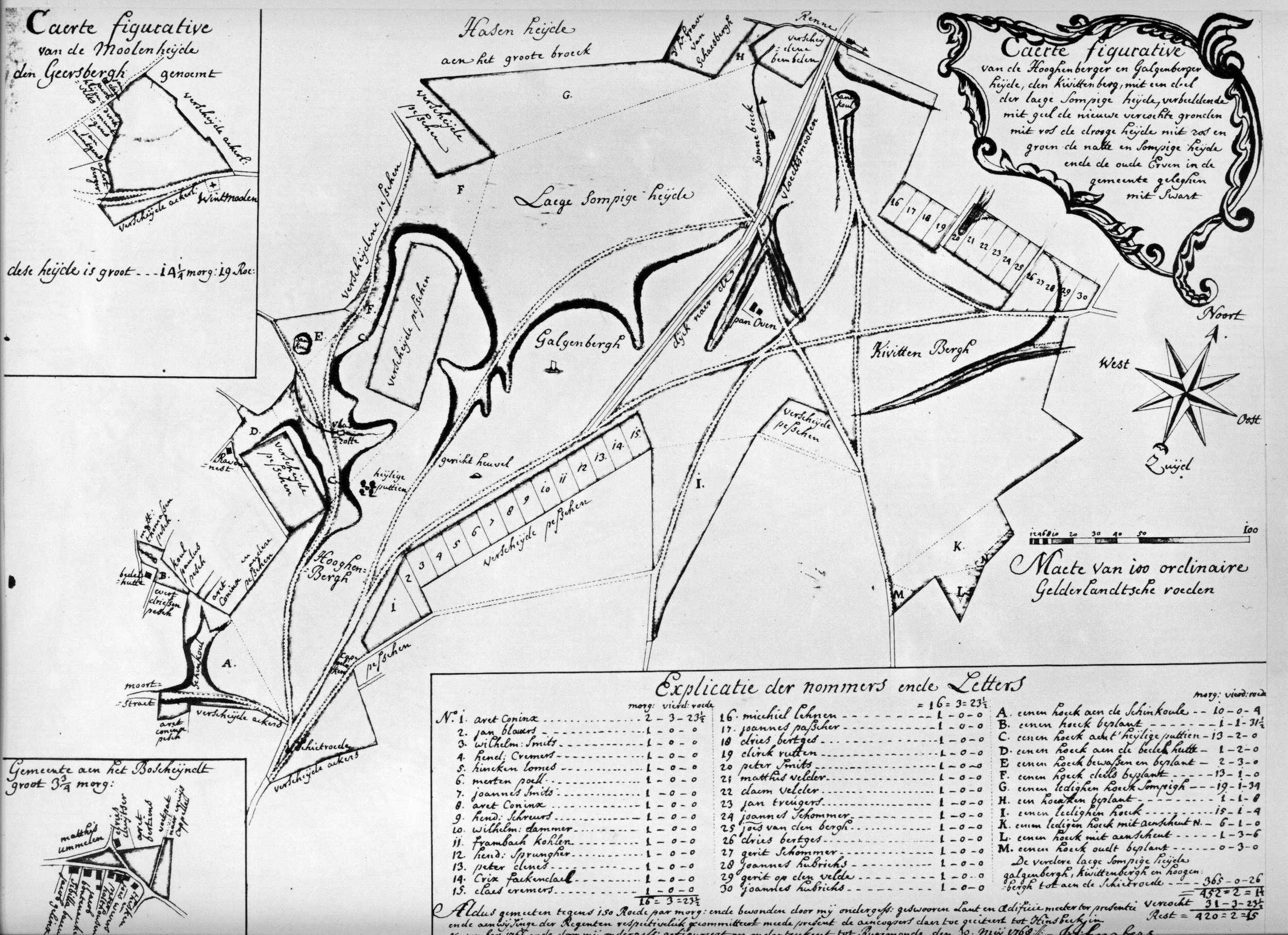 Obige Karte von 1768 zeigt die Lage der Gerichtsstätte („gerichts heuvel“) und des „Galgenberghs“ auf der Hinsbecker Heide.